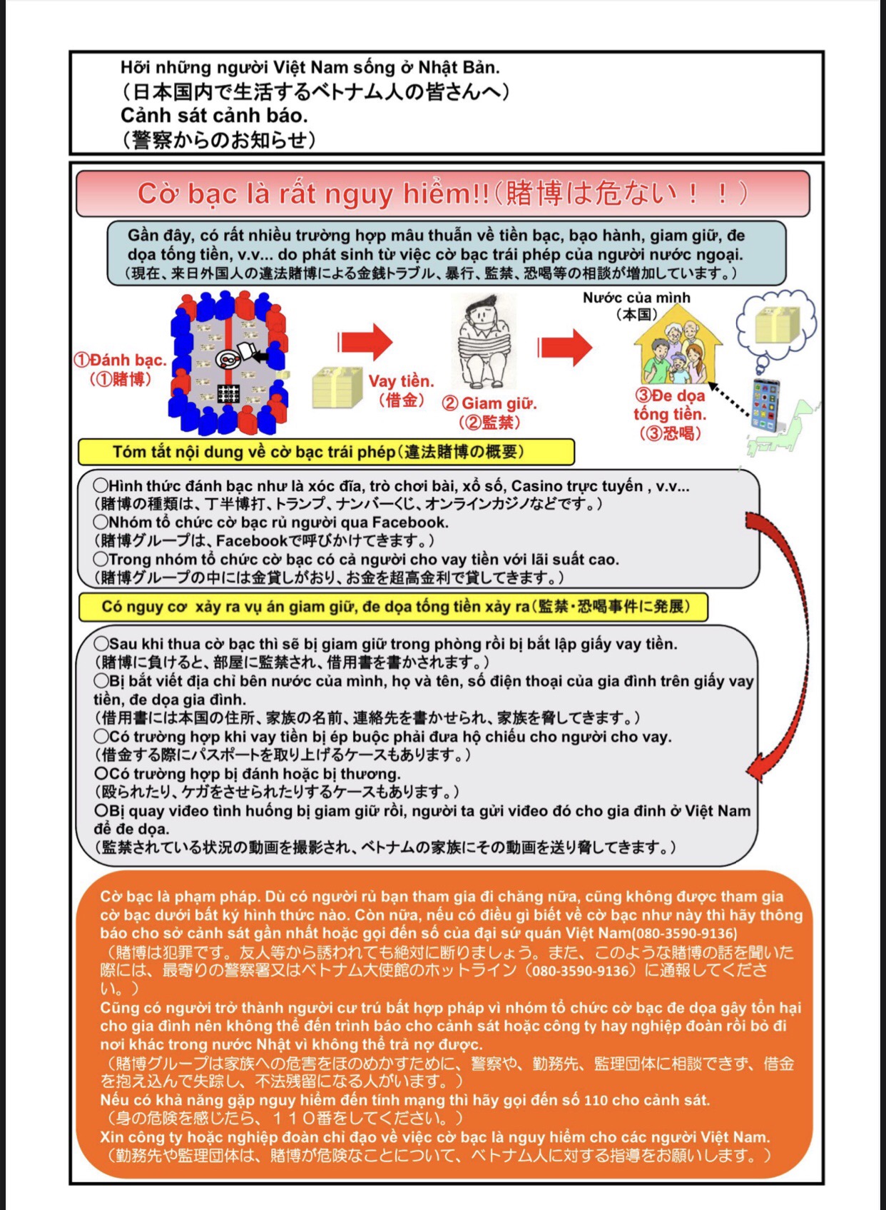 – Theo thông tin của cơ quan Cảnh sát quốc gia Nhật Bản, Thời gian gần đây tình trạng một số người Việt Nam tại Nhật Bản bao gồm các lao động, thực tập sinh đánh bạc bằng nhiều hình thức khác nhau dẫn đến nợ nần, bị bắt giữ trái phép để đòi nợ, tống tiền gây ảnh hưởng xấu đến hình ảnh người Việt Nam tại Nhật Bản nói chung, lao động Việt Nam nói riêng.