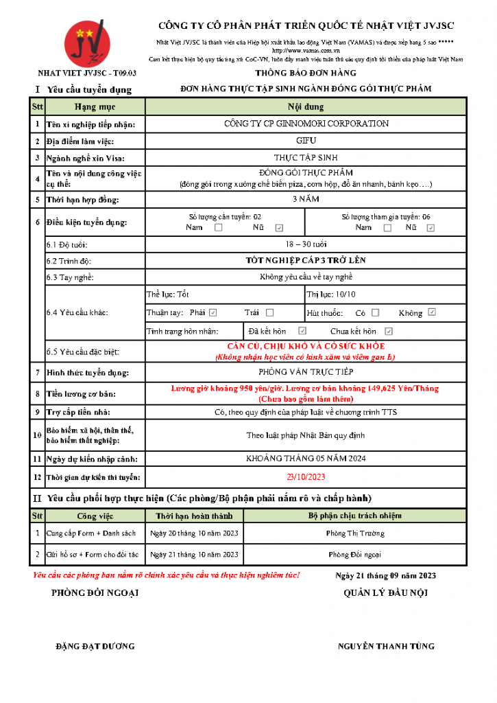 Nhật Việt JVJSC xin thông báo tuyển gấp 06 lao động NỮ tham gia thi tuyển đơn hàng ĐƠN HÀNG THỰC TẬP SINH NGÀNH ĐÓNG GÓI THỰC PHẨM