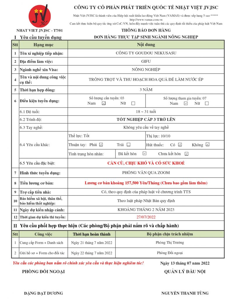 Nhật Việt JVJSC xin thông báo tuyển gấp 07 lao động NAM tham gia thi tuyển đơn hàng ĐƠN HÀNG THỰC TẬP SINH NGÀNH NÔNG NGHIỆP