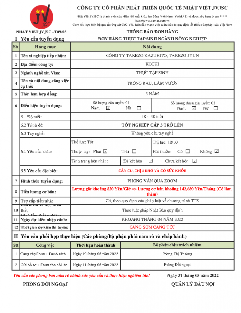 Nhật Việt JVJSC xin thông báo tuyển gấp 03 lao động Nữ tham gia thi tuyển đơn hàng ĐƠN HÀNG THỰC TẬP SINH NGÀNH NÔNG NGHIỆP TẠI KOCHI NHẬT BẢN thi tuyển trong T4/2022.
