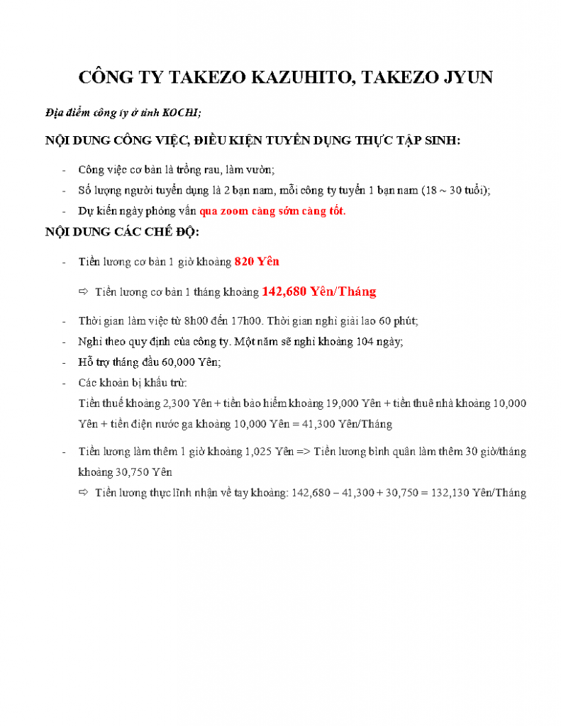 • Xí nghiệp làm việc: CÔNG TY TAKEZO KAZUHITO, TAKEZO JYUN