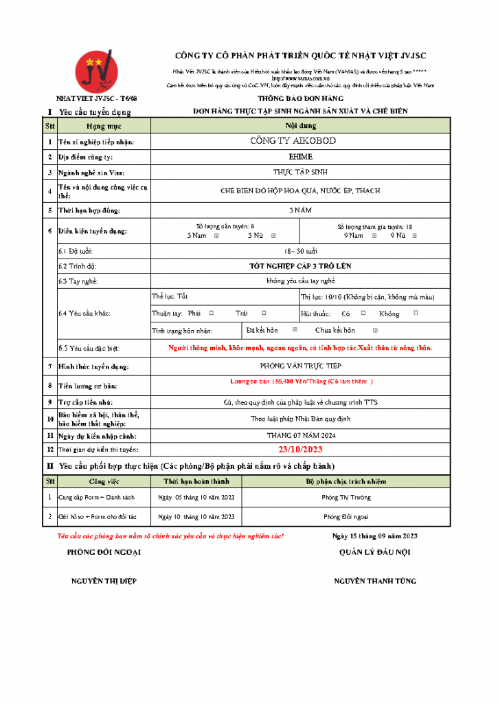 Nhật Việt JVJSC xin thông báo tuyển gấp 09 lao động NỮ + 09 lao động NAM tham gia thi tuyển đơn hàng ĐƠN HÀNG THỰC TẬP SINH NGÀNH SẢN XUẤT VÀ CHẾ BIỂN THỰC PHẨM