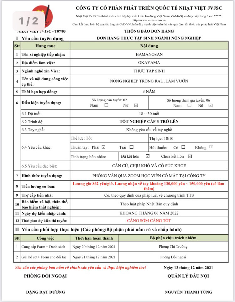 Nhật Việt JVJSC xin thông báo tuyển gấp 02 lao động Nữ tham gia thi tuyển đơn hàngTHỰC TẬP SINH NGÀNH NÔNG NGHIỆP TẠI OKAYAMA thi tuyển trong T4/2022.
