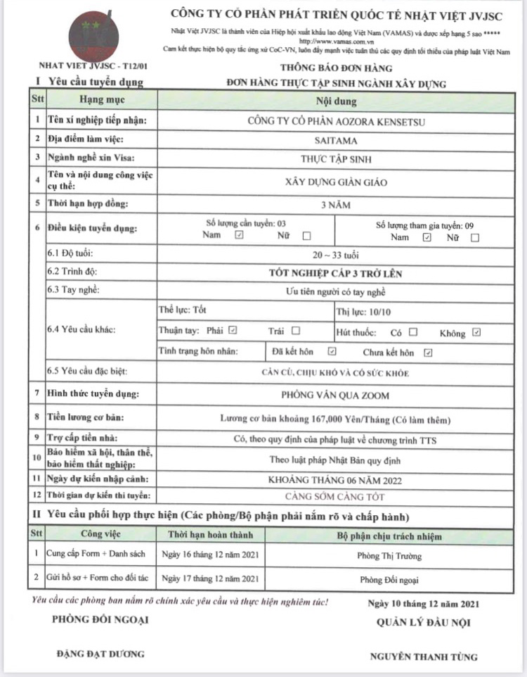 • Số lượng thực tập sinh cần tuyển: 03 Nam